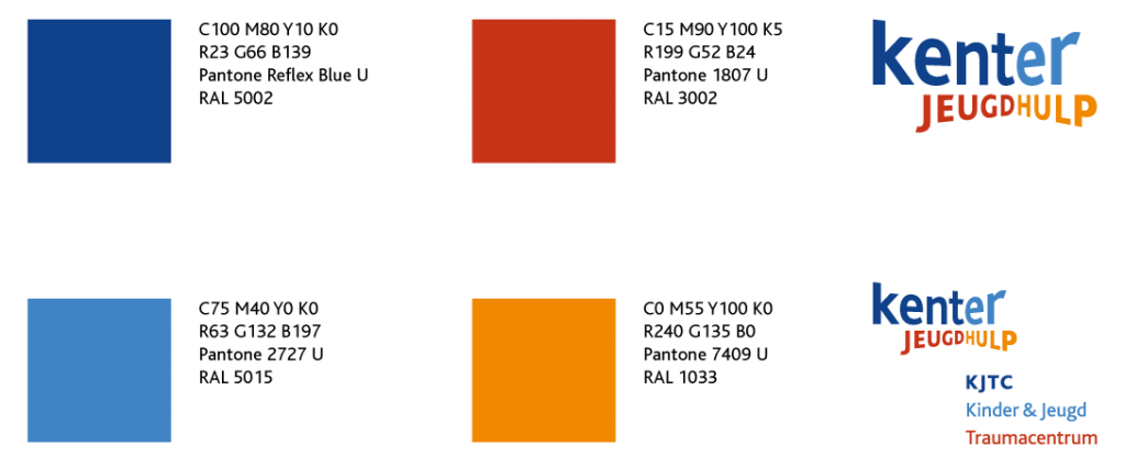 Het gebruik van de juiste kleurwaarden is belangrijk om de huisstijl, en daarmee Kenter Jeugdzorg, een consistente uitstraling te geven. Kleuren moeten in alle media zo goed als mogelijk op elkaar aansluiten.